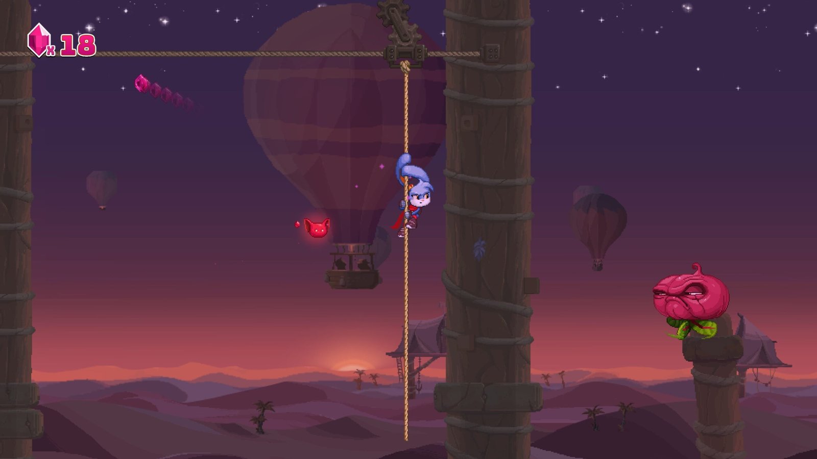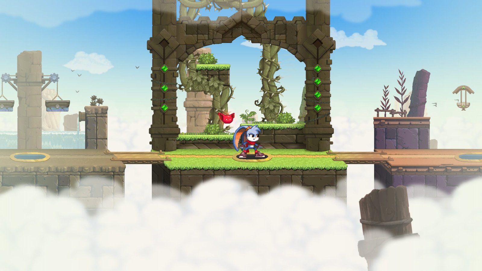 As a 2D side-scroller, the player moves across the screen and is tasked with a variety of elements to overcome. Jumping to new platforms and over gaps and defeating enemies along the way with a spin attack or by jumping on their heads comprises the core gameplay by its simplest definition but Kaze is far more layered than that.