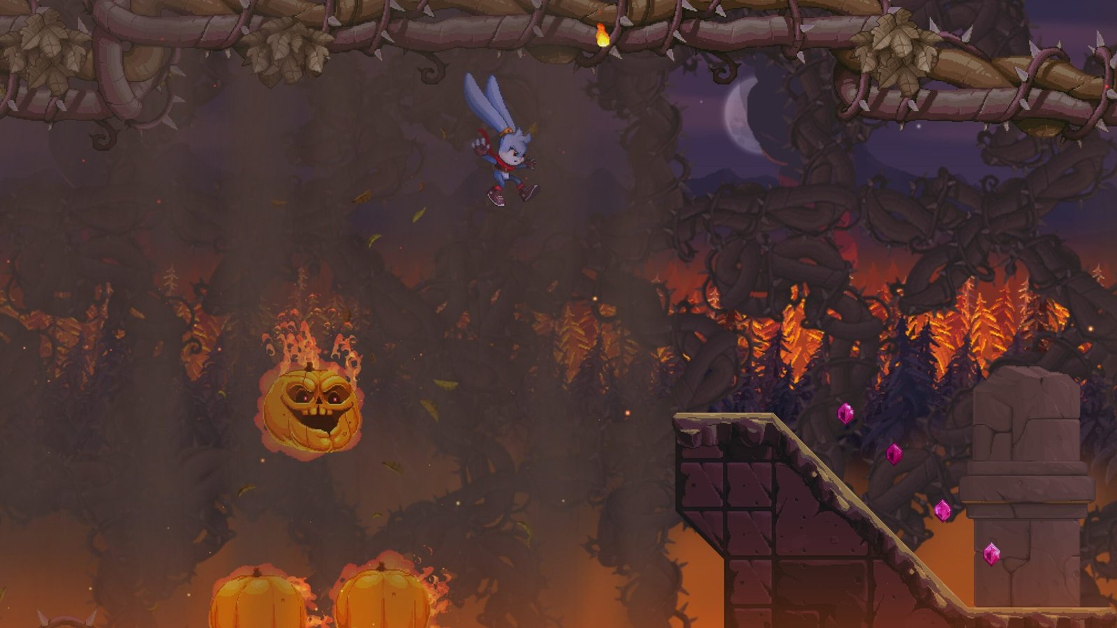 An incredibly enchanting score that varies depending on the versatile locations Kaze travels to nails the feeling and uniqueness that each level brings. Accompanied by beautiful and vibrant artwork of these locations and the charming character models, particularly the menacing vegetable enemies that are playfully creative themselves, the overall feeling of the audio-visual tag team is nostalgic, mesmerising and outright wonderful on every level. The simplicity of the art is brilliantly amplified by the subtle details present in every aspect of the characters, environments and the audio happenings that genuinely remind me of my earliest childhood gaming memories.