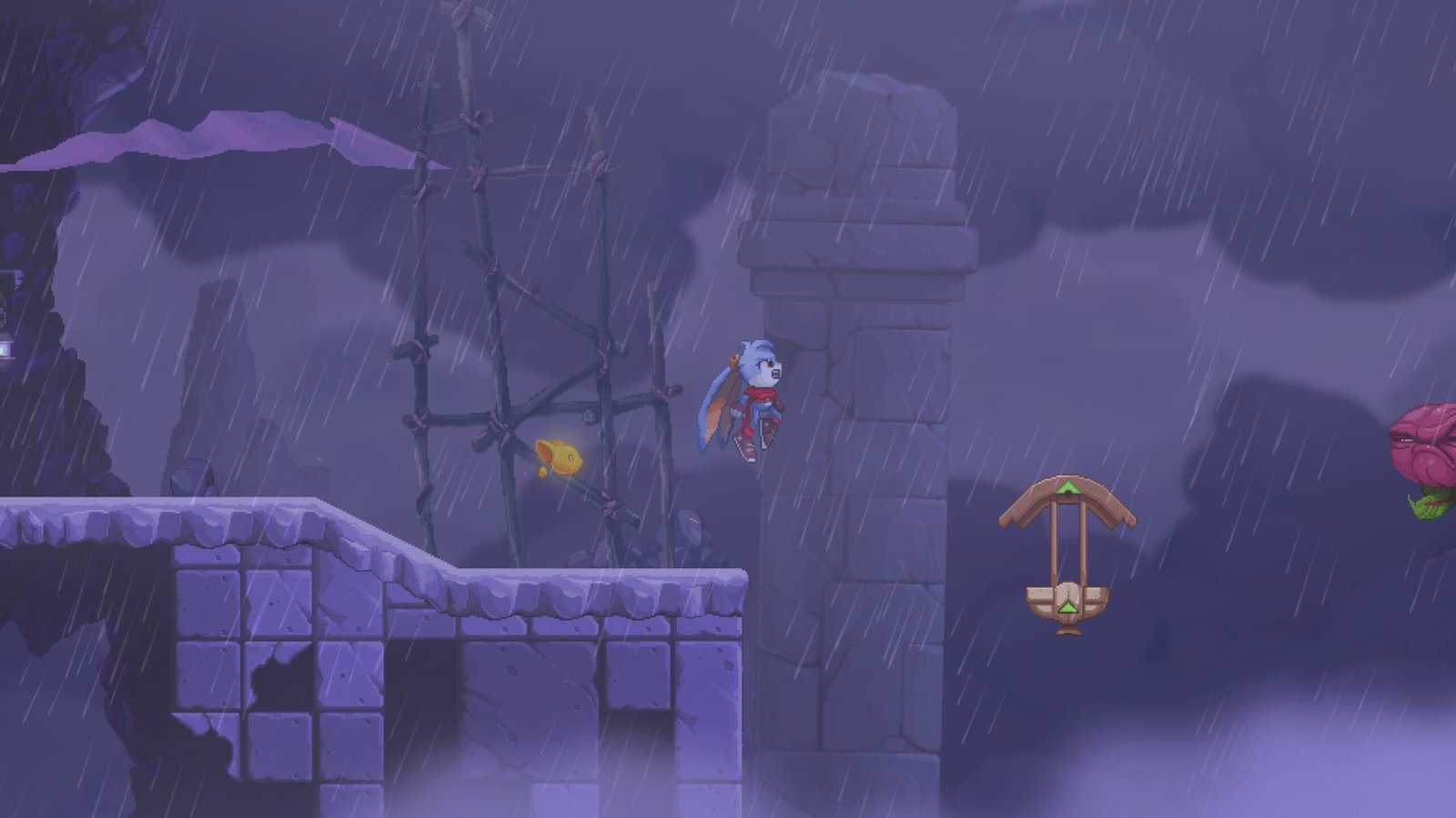 Every few levels a new mechanic is introduced to mix things up such as moving platforms and ropes to climb or crossbows that shoot Kaze in a visually indicated direction for instance but perhaps the most fun mechanics are the masks. Appearing at predetermined and unmissable points in most levels are statues with a mask that Kaze can equip. Embracing and embodying the spirits of these masks affords Kaze special abilities that are fun, varied and interesting.