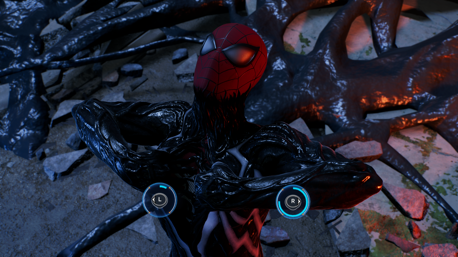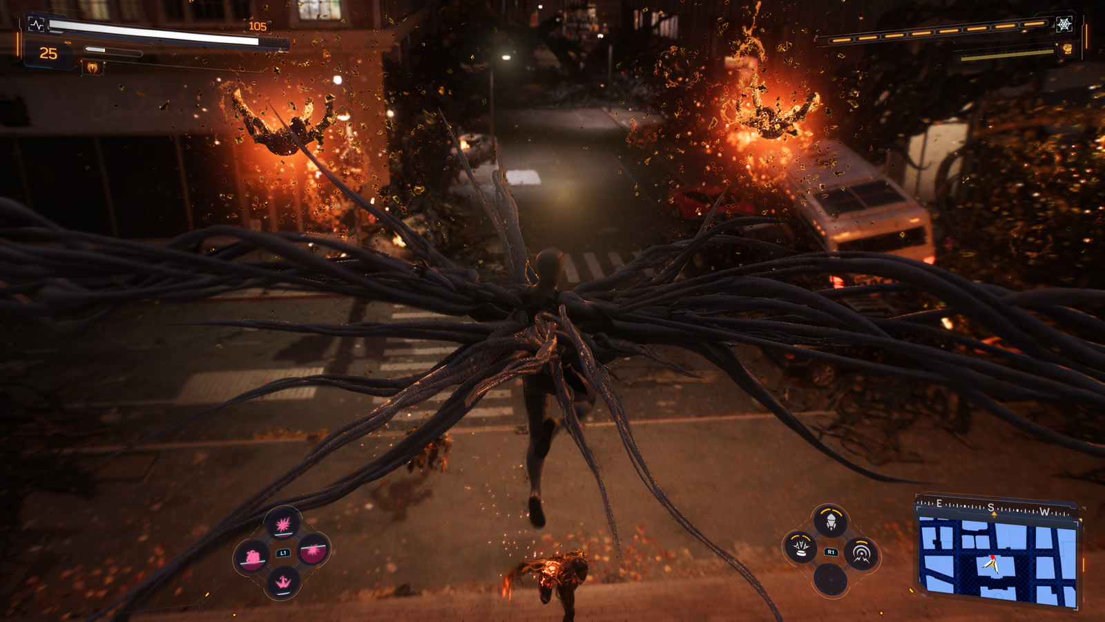 With all this talk about story it’s time to dive into what else Spider-Man 2 delivers. Epic gameplay. With inspirations rooted in Rocksteady’s equally epic Arkham franchise cantered on Batman, there’s a clear connection to players of both franchises. While Batman’s Arkham titles have a free-flowing combat feel that doesn’t quite hit the same in Spider-Man. The seamless transition from attacking one enemy to the next is still satisfying, it doesn’t quite hit the stride of the Dark Knight’s war on crime. Combat at its core consists of light attacks, web attacks and combining those to create exciting combos. Performing attacks gradually builds a Focus meter and when each bar of that has been filled an awesome takedown can be executed that instantly disposes of foes in flashy Spider-Man style.